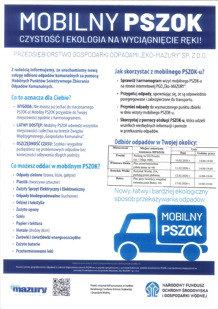 Przedsiębiorstwo Gospodarki Odpadami "EKO-MAZURY" spółka z o.o. informuje, że uruchamia po raz kolejny usługę odbioru odpadów komunalnych za pomocą Mobilnych Punktów selektywnego odbierania odpadów Komunalnych.